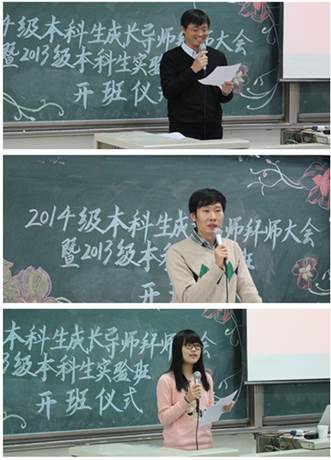 2014年12月3日下午,永利集团3044官网欢迎您在沙河校区主教219举行2014级本科生成长导师拜师大会暨2013级本科生实验班开班仪式。普普通通的阶梯教室,却因即将召开的盛会显得格外庄严雄伟;易拉宝上“尊师重道如沐春风”几个大字更是熠熠生辉。永利集团3044官网欢迎您院长赵景华、党总支书记吕丽、科研处副处长邢华、党总支副书记栗玉香、副院长王红梅、于鹏以及各系的老师们和13、14级200多名同学出席了会议。王红梅老师和行政管理14班刘钰鹏同学担任主持。