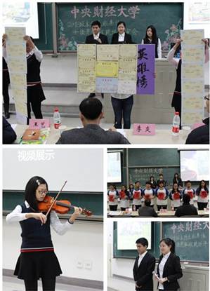 在国政13班5分钟的展示时间内,两名主讲人用慷慨激昂的语调介绍了班级在大学一年级取得的成绩,将每位同学的成绩和班级团体成绩全部展现在大家的面前。为了配合两位同学的解说,也为了更具说服力,20多位同学手举贴满各类证书奖状的展板。整场展示极具画面感和感染力,介绍基调昂扬,现场气氛热烈,观众反响强烈。介绍完毕,两位同学代表接受评委提问,用谦逊又不失精准的语句回答评委的问题,充分体现了国政人的情商和应变力。