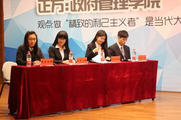 政管辩论队作为正方,首先以“‘精致的利己主义者’是当代大学生面向社会的必然选择”为观点进行开篇立论。政管队用“大学生毕业后工作生活的艰难现实”、“当下社会的双重话语体系”以及“长期社会意识与习惯”作为论据,为自己的观点构建了三条战线。在此后的双方质询、自由辩论中,统计与数学学院用充分的准备从多重角度对政管队的防线展开了突破。双方你来我往,引经据典,剖析事实,严密推论,犀利的观点与缜密的思维赢得了台下观众的阵阵掌声。虽然政管队一度陷于让步境地,但队员们果断、犀利地抛出“主观评判他人利己不得当”、“精致的利己不是低俗”两条观点,牢牢地防守住了己方阵地。在最后的陈述总结里,政管四辩刘婉玉思路清晰、声调顿挫、情绪激昂,结合对方漏洞与社会实际对己方整场辩论做了画龙点睛之笔。