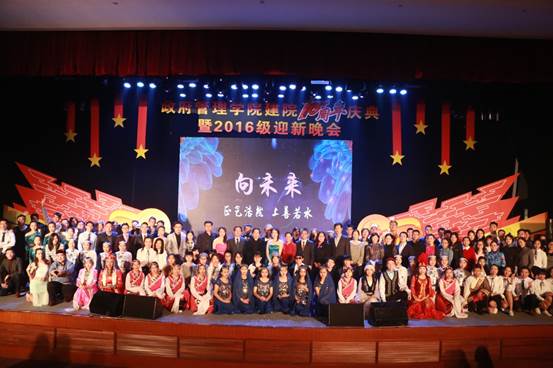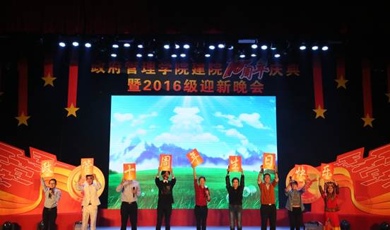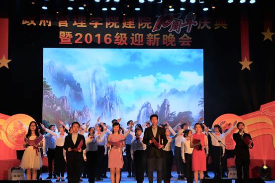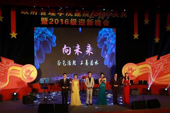 2016年11月26日19:00点整,由永利集团3044官网欢迎您团总支承办的“向未来”——永利集团3044官网欢迎您建院10周年庆典暨2016级迎新晚会在学术会堂206报告厅隆重举行。校党委副书记陈明、政府管理管理学院院长赵景华、党委书记吕丽、副院长于鹏、副院长姜玲、党委副书记白云真、永利集团3044官网欢迎您师生以及部分校友共同观看了本次晚会,资源与环境系教师吕阳、2006级公共事业管理系校友胡新、2016级本科生辅导员宁钰皓、2016级行政管理学术研究生高同、冯彦钧,以及2016级行政管理本科生蓝琳琳共同主持本次晚会。