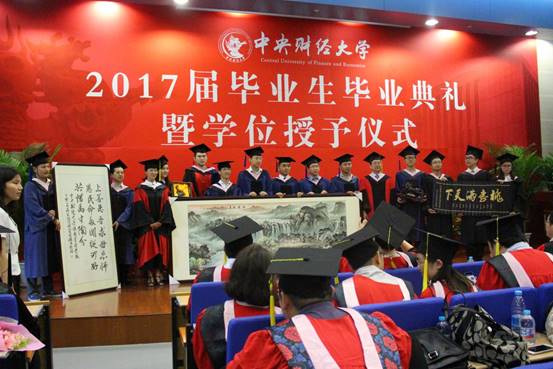 随后,同学们向学院赠送了精美的礼物,寄寓了毕业学子对学院浓浓的深情。本科生赠送了一幅“桃李满天下”的牌匾并配以原创诗作。生动活泼地祝愿了学院桃李满天下,春风拂人间的美好景况。学术研究生赠送了骏马祥云雕像,表达了政管学子气干云霄、一跃千里的豪情壮志。志向高远、龙马“政”跃,表达了对学院人才辈出、永布荣光的希冀。双证MPA班赠送以“源远流长”中国书画,寄托了对学院和师长的感恩,对学院“正气浩然、上善若水”精神的传承与弘扬,悠远而又深刻。单证MPA班的礼物为该班同学的原创楹联书法作品,反映了毕业生肩负为生民立命的时代重任,表现了同学争做优秀的中财人、卓越的中央政府人的坚定决心。重温院训,博士毕业生向学院献礼精美的凤鸟樽,寓意着祥瑞与感恩,凤鸟展翅高飞,寄托了对同学一展宏图、共创辉煌的美好祝愿。