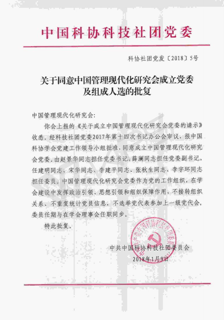 社团党发2018005号文:关于同意中国管理现代化研究会党委及组成人选的批复