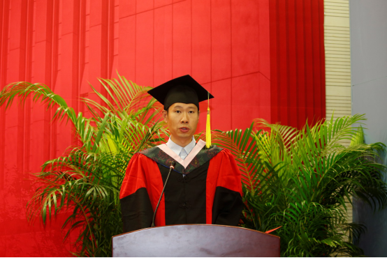 典礼进行第五项,毕业生代表发言。2018届本科生代表行政管理14班杨崇祺与2018届研究生代表学术型硕士16班朱洁相继发言。杨崇祺以轻松诙谐的语言道出了他一直深藏心间的三个感谢:感谢同学四年的帮助和相互扶持,让他感受到家的关怀与温暖;感谢老师的细心栽培和教授,师恩四年,永生难忘;感谢父母默默的支持,一路的成长离不开他们无悔的付出。最后,杨崇祺与所有的毕业生们分享了八个字:忠诚、团结、正气、担当,并祝愿老师亲友们身体健康,祝愿学院桃李满天下。接下来,朱洁作为研究生代表发言。朱洁在表达对学院和老师同学们的深深感谢之后,提出了思考:漫漫求学路,学院带给同学们的到底是什么?朱洁认为,大学之道,最重要的是教会他怎样做一个大写的人:做人上有格局与情怀,做事上懂责任与担当,做学问上崇尚真理与敢于质疑。朱洁认为学会做人,学会做一个大写的人,才能无愧于“中央政府人”的称号!最后,朱洁祝愿学院再创辉煌,祝愿老师们身体健康,祝愿学子们前程似锦!
