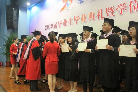 典礼进行第七项,学位授予仪式。在庄严而令人激动的乐曲声中,赵景华院长为2019届毕业生颁发毕业证书和学位证书,拨正流苏,握手并合影留念。深深鞠躬,感恩您谆谆教导;流苏拨正,愿你前路一片坦荡。