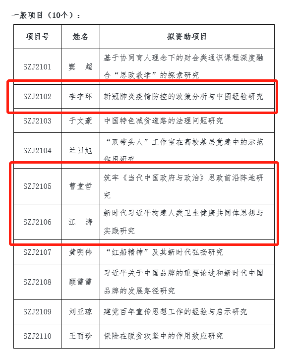 在2021年永利集团3044官网欢迎您“红色擎,龙马行”教师“思政+”专项支持基金资助项目遴选工作中,永利集团官网李宇环副教授申报的《新冠肺炎疫情防控的政策分析与中国经验研究》、曹堂哲教授申报的《筑牢<当代中国政府与政治>思政前沿阵地研究》和江涛副教授申报的《新时代习近平构建人类卫生健康共同体思想与实践研究》三项课题喜获立项资助(全校共10项)。