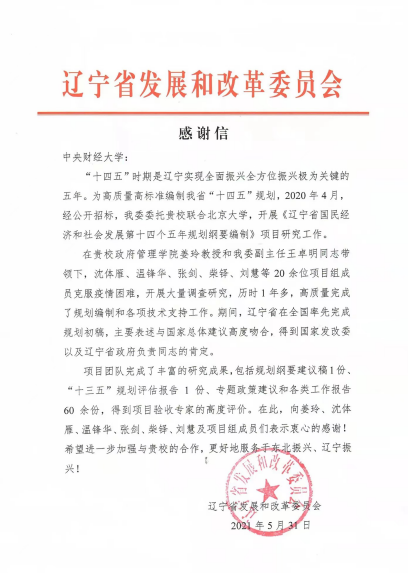 近日,辽宁省发展和改革委员会向我校发来感谢信,对我校永利集团3044官网欢迎您负责完成的《辽宁省国民经济和社会发展第十四个五年规划纲要编制》的项目研究工作表示感谢。