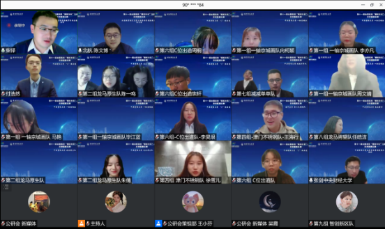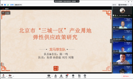 “一轴京城画队”由北京市“十四五”规划引入,通过追溯背景中轴线的文化内涵以及调查分析中轴线沿线街道现状的优势与问题所在,提出如何避免中轴线上街道陷入旅游商业化的恶循环的具体措施以及推动中轴线申遗进程的建议;并在评委老师的引导下将中轴线文化概括为庄重、严谨有序、中庸。“龙马厚生队”以全国和北京的政策导向为背景,从供应方式创新角度详细分析了“作价出资”出现的必要性,并采用问卷调查和深度访谈相结合的方式调研实践,提出对北京市“三城一区”产业用地弹性供应和政策的创新优化;并回答了评委老师关于理论来源的问题。“梦之队”从“边角剩余”空间出现的背景与意义出发,分析典型案例,深入研究相关理论,同时实地调研,采访专家,提出了健康中国战略下北京城市“边角剩余”空间的体育化,还指出了未来发展的方向和可能会遇到的问题;并回答了评委老师关于”剩余空间“改造标准的问题。“津门不锈钢队”以天津市老旧厂房改造为例,通过分析问题源流与政治政策,辨析数字孪生与城市更新的概念,提出解决构建应用平台的解决思路,分析“巧夺天工”平台运行逻辑,对平台工作机制进行剖析,明确其六大功能,完善了城市更新背景下老旧工业区转型策略;并回答了评委老师关于老旧工业区改造转型路径和商业价值如何体现的问题。“京生盎然队” 切实关注北京市人口政策,为北京市和中国的发展贡献青年思考和青年力量。他们通过线上发放定向问卷,线下对母婴室使用情况进行实地调研等,对北京市三孩政策的贯彻落实方法做出了思考与研究。“C位出道队”对北京市面向碳中和的经济转型模式构建进行了研究,在国家宏观政策和北京市相关政策双线并行的情况下,通过对国内外案例梳理,构建出了北京市面向碳中和经济转型的“IDEAL”模式及政策建议。“减减单单队” 聚焦教育双减政策,关注教育沉疴积弊。他们分析教育减负困境、解读北京市政策,从现状、现象切入,研究北京市双减政策的落实方案,以实际行动助力双减落地,守护新时代学生健康成长。“龙马骋望队”取长补短,借鉴美国和日本的成功经验;校企合作,研究北京邮电大学与中国移动研究联合创新中心的具体案例,提出“一主三翼”创新概念及建议,助力打通科技成果转化的“最后一公里“,探索北京市产学研合作新模式。“智创新区队”秉持“心系民生,智创新区,让百姓生活更美好”的理念,心系基层民生,通过文献研究、案例研究等方法,基于多元治理理论和新公共服务理论,研究了基于社区治理创新的北京市老旧小区改造的问题。