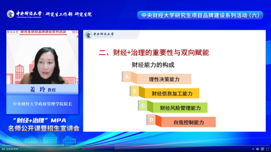 永利集团3044官网欢迎您院长姜玲教授以“提高财经素养,赋能公共治理”为题,围绕MPA教育的使命和趋势、财经+治理的重要性及双向赋能、财经+治理的内容供给三方面内容,为大家带来了一节干货满满的主题公开课。姜院长指出,面对百年未有之大变局、新技术快速迭代以及新时代新征程新发展阶段的时代背景,复合型知识体系和技能体系、国际和国家战略视野成为现代化公共管理人才的基本素质。公共管理从业者不仅需要遵循公共价值的基本导向,掌握公共管理基础知识体系,还要兼具数智技术与财经领域的工具技能。作为中国财经管理专家的摇篮,中财MPA充分发挥学校特色学科优势,聚焦财经+治理,为MPA人才培养提供特色鲜明的综合性知识供给,围绕财经知识体系、话语体系与能力提升构建系统性培养体系,全面赋能学生成长。最后,姜教授欢迎广大考生积极报考中财MPA,在财经管理专家的摇篮中实现财经+治理的双向赋能,成为懂治理、懂财经的复合型高级人才。