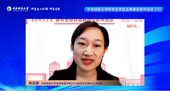 周志鹏认为在中财MPA的三年时光是她开阔眼界的三年、成长进步的三年。中财大MPA的学习让她收获颇丰,从学习的角度、深度、温度三方面给予了她全方位的帮助,不仅学习到系统专业的公共管理知识,更实现了思维和视野的突破,提升了综合能力,让她在日常工作中更加得心应手。她祝愿各位考生考研顺利,金榜题名,早日加入中财MPA大家庭。