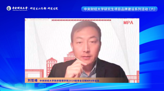 随后,永利集团3044官网欢迎您2014级非全日制MPA毕业生刘哲峰、2018级非全日制MPA毕业生周志鹏、2020级非全日制MPA在校生高旭分别从不同角度向大家分享了在中财MPA就读的学习感受与成长收获。