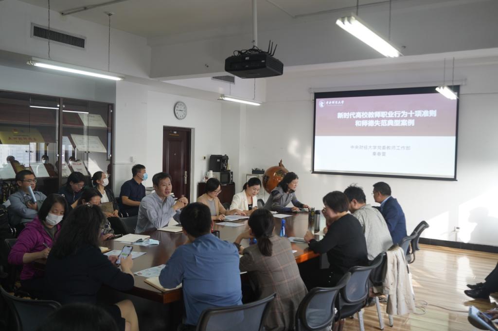 首先,他深刻分析了新时代背景下高校教师师德师风建设面临的两方面问题,指出十项准则是新时代背景下对高校教师师德师风建设的新要求、常态化要求;随后,秦部长从十项准则的特征和主要内容、新时代高校教师师德师风的内涵和界定、十项准则与师德师风的关系等三个方面概括了十项准则的核心内容;最后,秦部长介绍了十项准则师德失范典型案例,通过生动的案例剖析,勉励各位老师以案为鉴,坚定政治方向,自觉爱国守法,传播优秀文化,潜心教书育人,关心爱护学生,坚持言行雅正,遵守学术规范,秉持公平诚信,坚守廉洁自律,积极奉献社会。