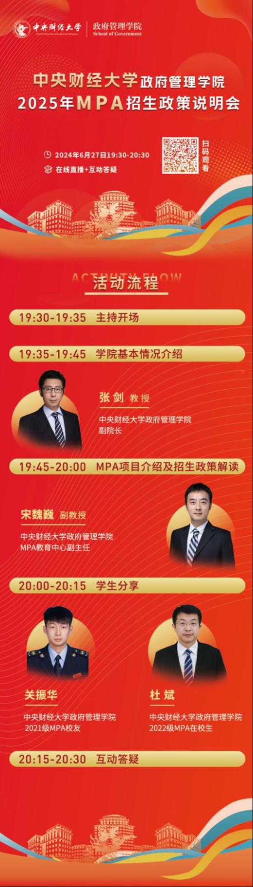 为助力考生更好地了解中财MPA项目的独特魅力和优势,确保意向考生能够迅速、全面且深入地掌握中财MPA项目的最新招生政策与详尽的项目信息,从而做出明智的报考选择,2025年永利集团3044官网欢迎您MPA招生政策说明会将于2024年6月27日19:30线上举办,诚邀各位有志之士踊跃报名参与,与国同行,携手共创辉煌的未来!