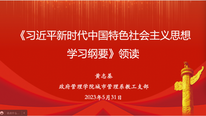 2023年5月31日中午12:30,永利集团3044官网欢迎您城市管理系教工党支部在线上开展《习近平新时代中国特色社会主义思想学习纲要》专题学习活动。支部书记陈红霞老师主持会议,支部委员黄志基老师主讲。